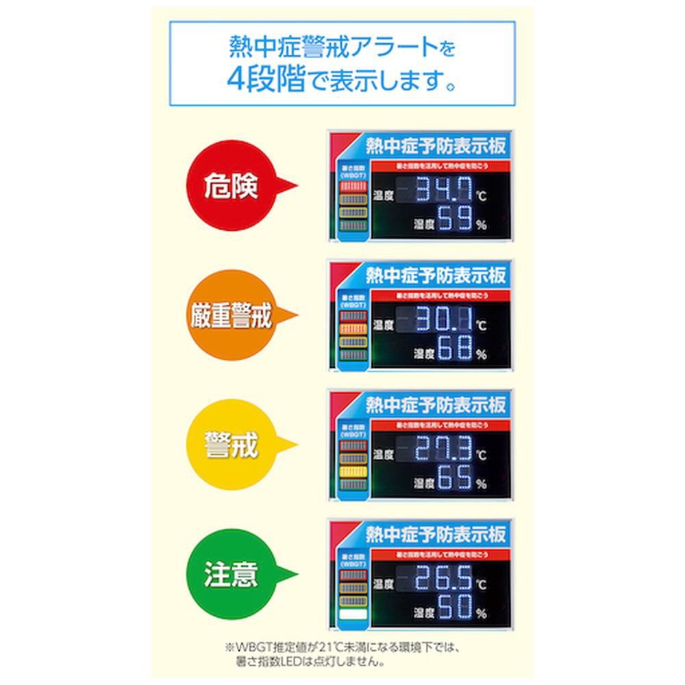 ・表示色(LED): 数字部/白色、WBGT/赤色・橙色・黄色・緑色 ※WBGTで表示色決定
