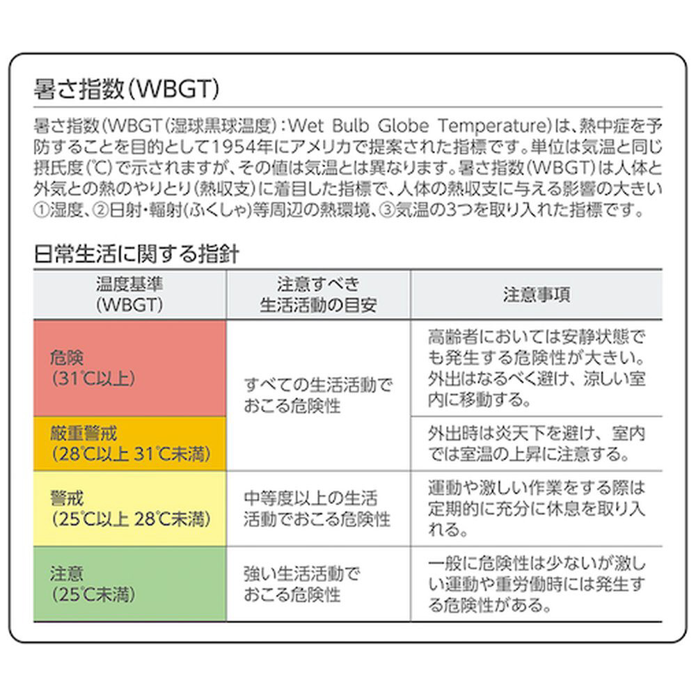 ・表示範囲: 気温/-20〜60℃、湿度/0〜100%、WBGT/0〜99℃(推定WBGT値) ※WBGTは数値表示はされません。