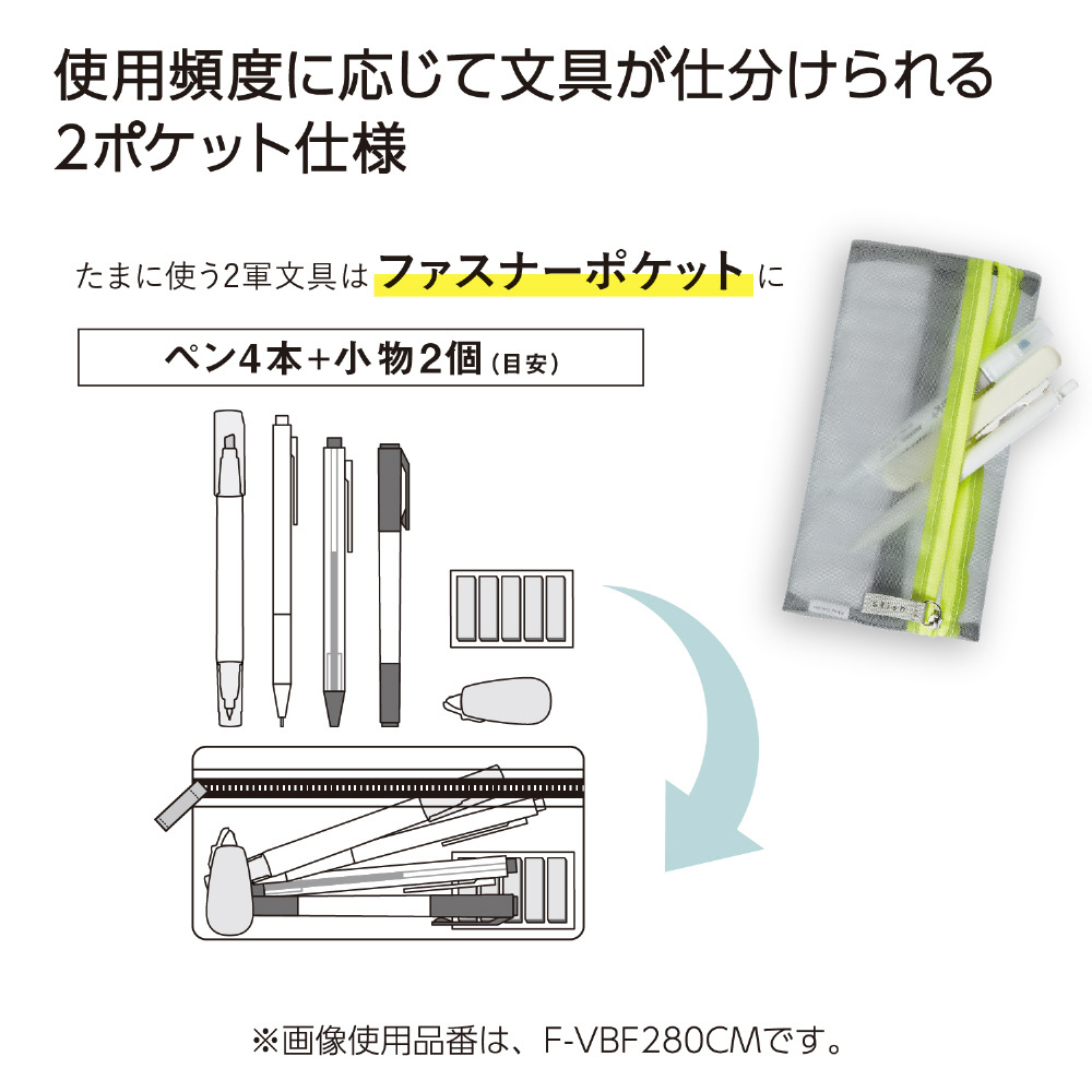 ●サブ文具や小物はファスナーポケットに!※目安:ペン4本+小物2個
