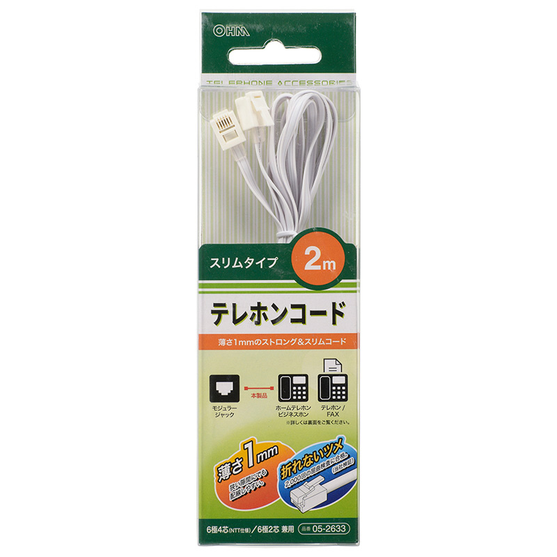 モジュラーケーブル [2m] テレホンコード スリムタイプ ホワイト TEL-C2633S
