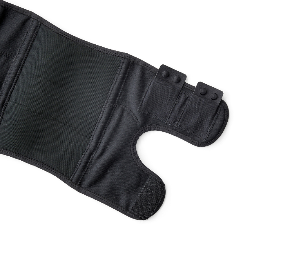 ひざの加圧を調整できるラップタイプ構造。メインラップとサイドラップの二重構造でひざのお皿を包みこむようにサポートします。