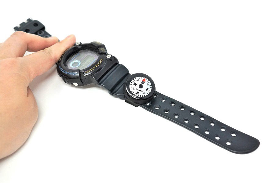 時計のベルトに装着して持ち歩ける、 ミニサイズのコンパスです。