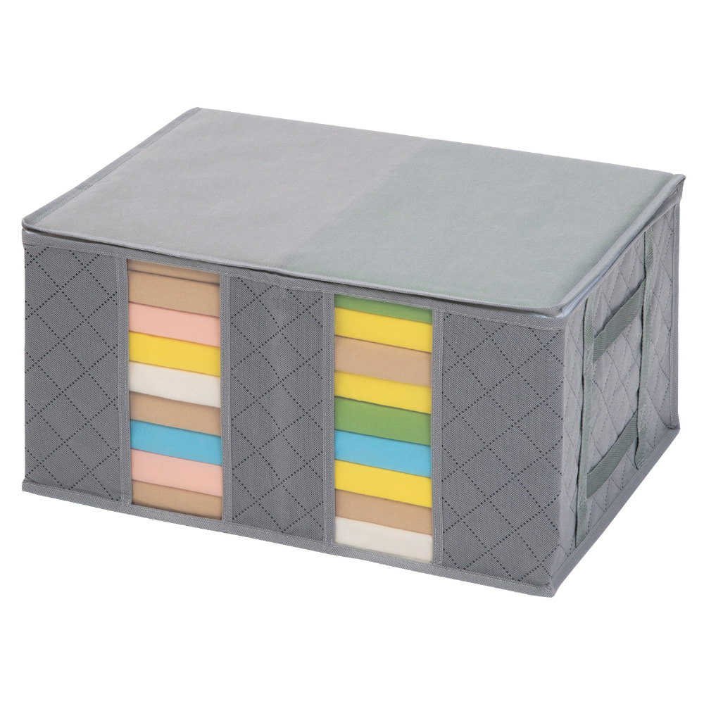 【商品仕様】:サイズ/約幅48×奥行35×高さ25cm、カラー/グレー、内容/1個、収納目安/セーターなどの厚手衣類なら:約6〜8枚・Tシャツなどの薄手衣類なら:約24〜28枚、材質/[本体]ポリプロピレン [中材]活性炭シート [透明窓]ポリエチレン