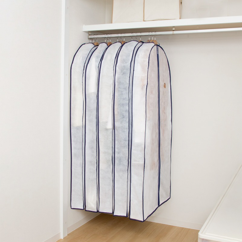 【商品仕様】:サイズ/約幅60×長さ140×マチ12cm、カラー/ホワイト、内容/5枚、材質/ポリプロピレン・ポリエチレン、収納目安(カバー1枚あたり)/薄手の衣類なら約3~5枚(ハンガーの厚みにより異なる。)