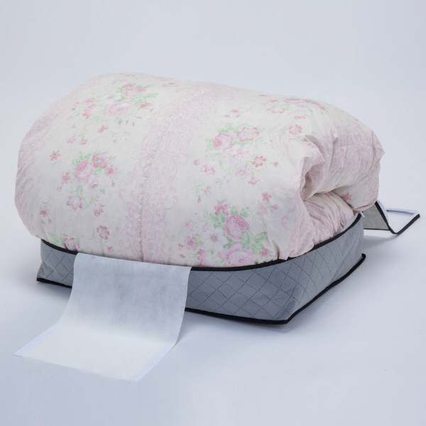 圧縮袋とは違い圧縮しすぎないので、次にご使用する際も羽毛がへたらず、出してすぐにご使用いただけます。急な来客時にも便利♪