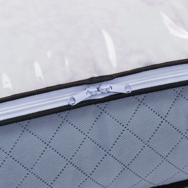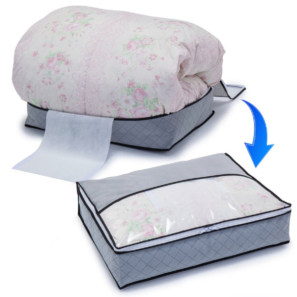 かさばる羽毛布団をコンパクトに収納できるケース。通気性の良い不織布に活性炭シートを挟んだ生地を使用。湿気やホコリから守りながら消臭もできる優れモノ!押し入れやクローゼットのデッドスペースを有効活用♪