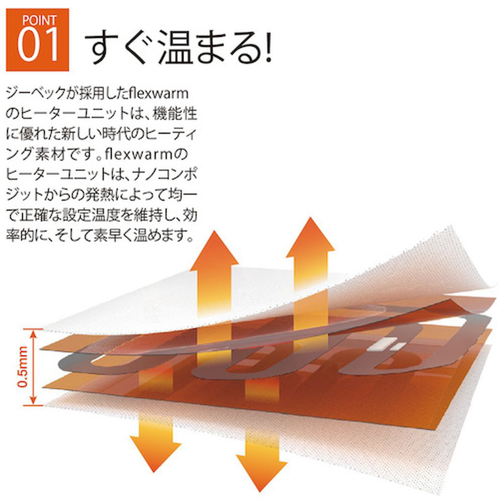 ジーベックが採用した発熱ヒートユニット: flexwarmは、ナノコンポジットの発熱により、均一で安定した熱伝導性を高めた電熱インナーベストになります。