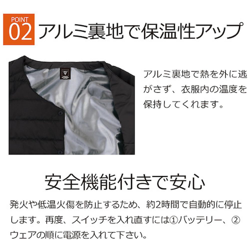 ■背中と腰の2ヵ所で発熱し、アルミ裏地で熱を逃がさない構造をしています。