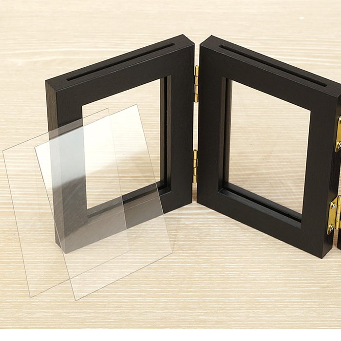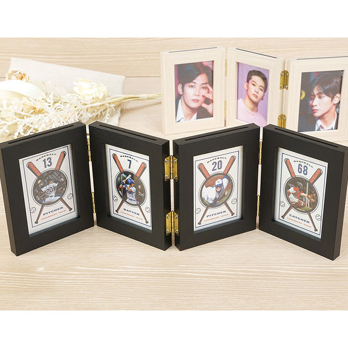 最大65×91mmまでのトレカやL判ハーフサイズを表裏あわせて8面で飾れます。