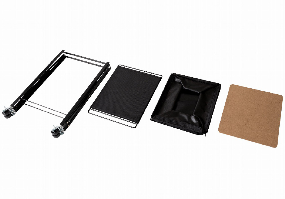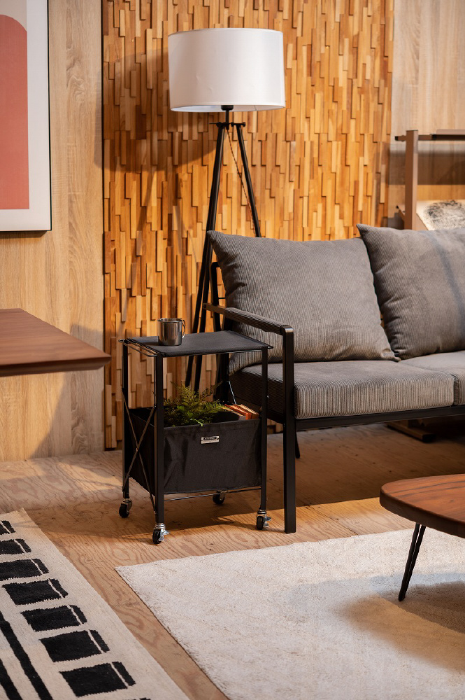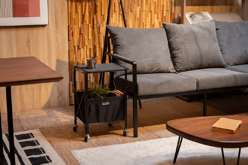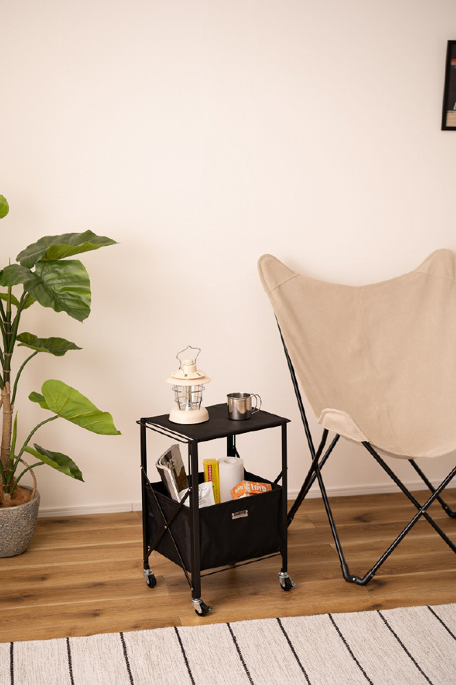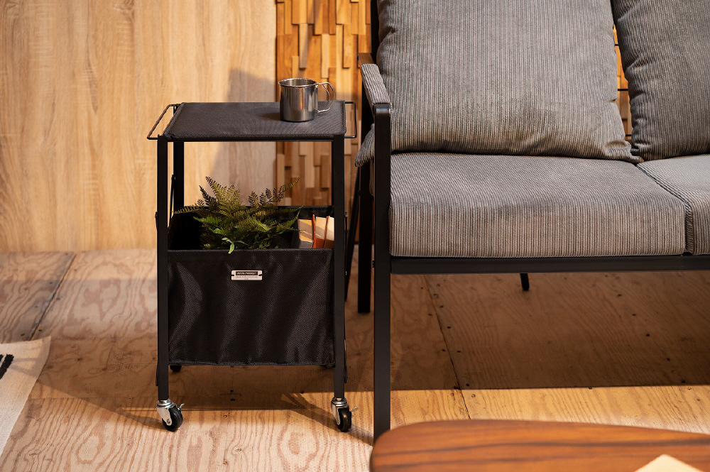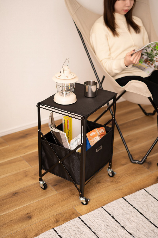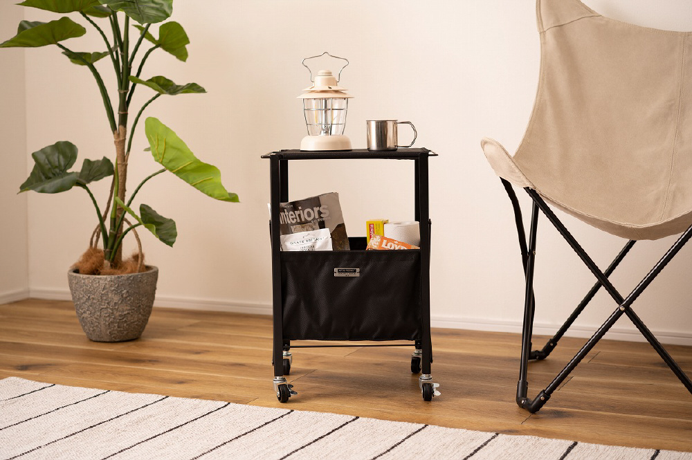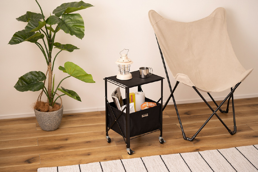 ■折りたたみができるテーブルワゴン/折りたたみができて、コンパクトに持ち運べる『フォールディングテーブルワゴン』。脚先にはストッパー付きのキャスターが取り付けられているので、移動も固定も楽に行うことができます。室内だけでなくアウトドアシーンにもぴったりなアイテムです。