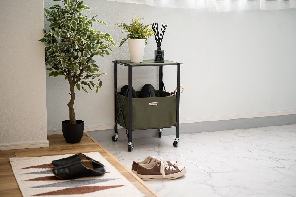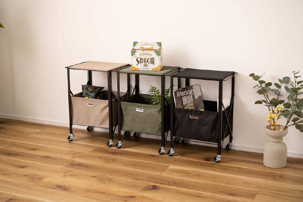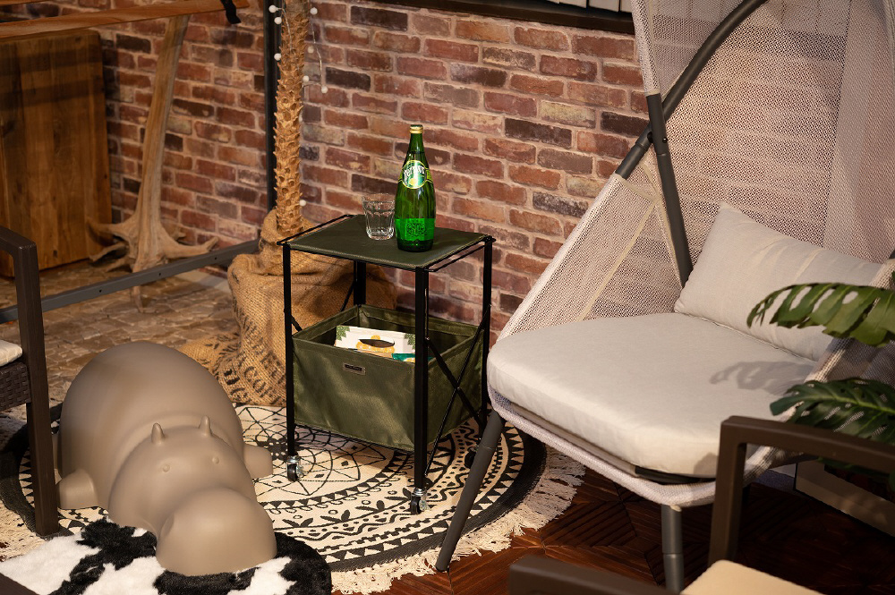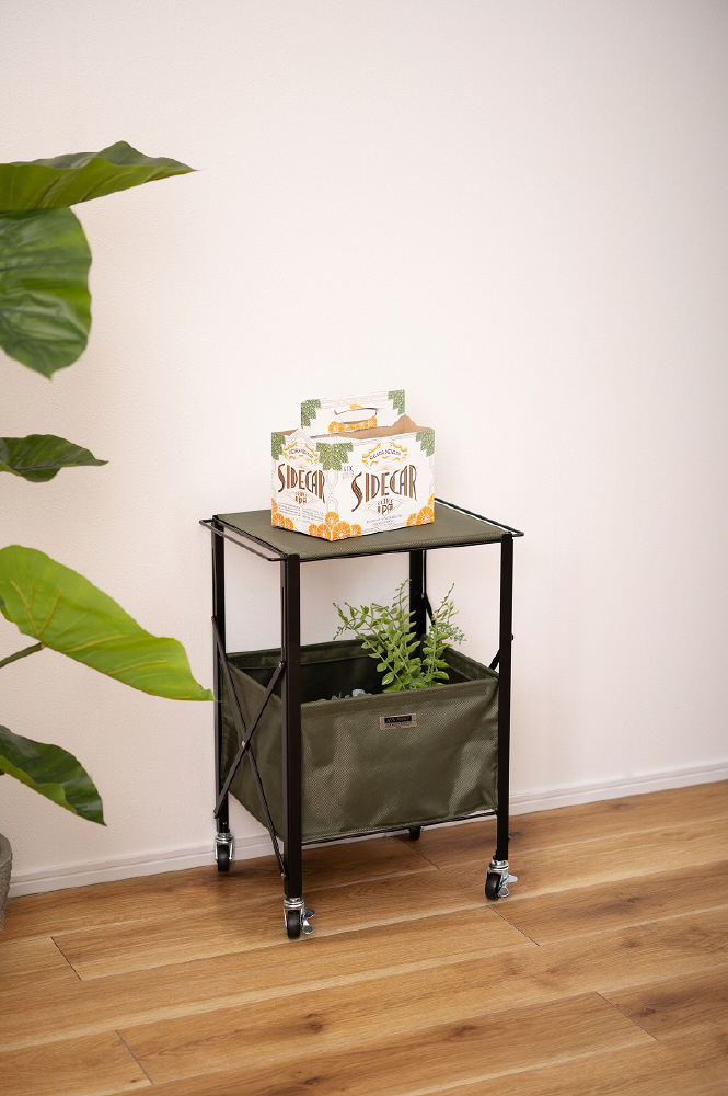 ■折りたたみができるテーブルワゴン/折りたたみができて、コンパクトに持ち運べる『フォールディングテーブルワゴン』。脚先にはストッパー付きのキャスターが取り付けられているので、移動も固定も楽に行うことができます。室内だけでなくアウトドアシーンにもぴったりなアイテムです。