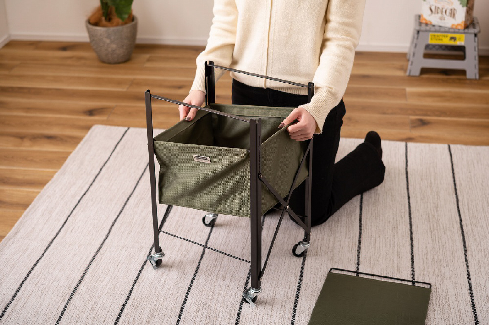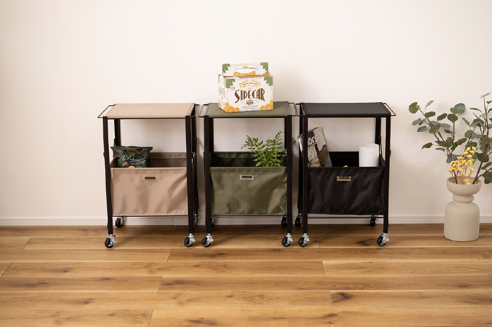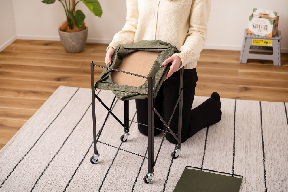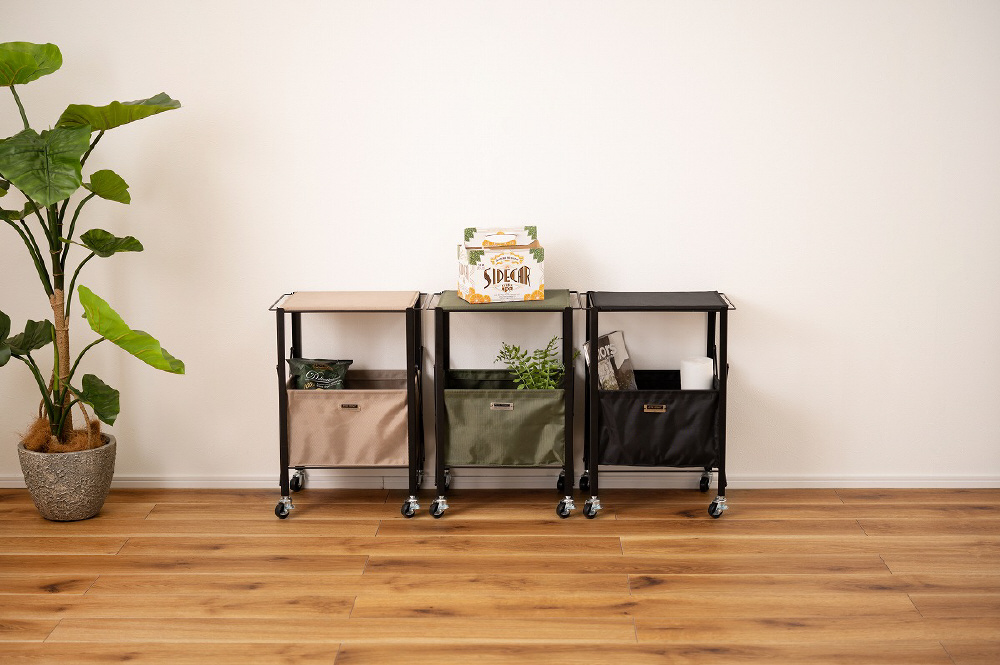 ■折りたたんでコンパクトに/こちらのテーブルワゴンはスリムに折りたたむことができるため、収納や持ち運びも手軽に行うことができます。使用しないときや移動のときは、サッと折りたたんでお部屋の隙間やトランクルームに収納しておけます。
