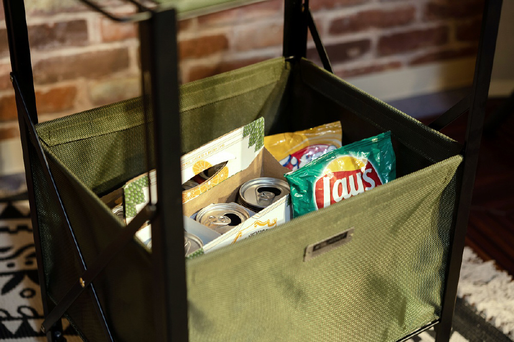 ■収納力も抜群/こちらのテーブルワゴンは幅39.5×奥行30×高さ55cmとスリムなサイズ感でありながら、下部のバスケットには十分な収納スペースがあります。大袋のお菓子や雑誌などもスッキリ収納が可能です。