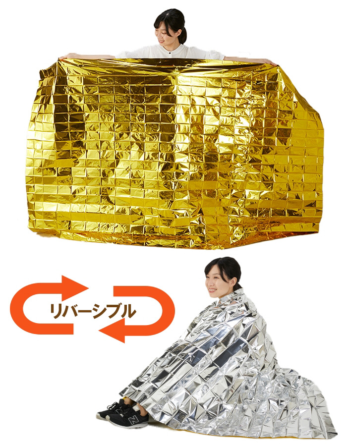 金色面:金色を表にすると太陽光などの熱を吸収し、裏面の銀色面は体温を反射して体を温めます。またキラキラと目立ちやすく、遭難時の発見にも役立ちます。銀色面:銀色面を表にすると直射日光を反射するので、炎天下でも比較的涼しくなります。