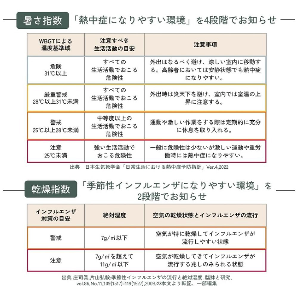 暑さ指数と乾燥指数で熱中症や季節性インフルエンザになりやすい室内環境をお知らせ。