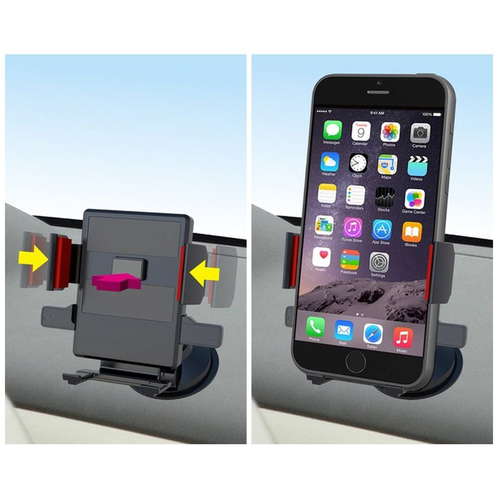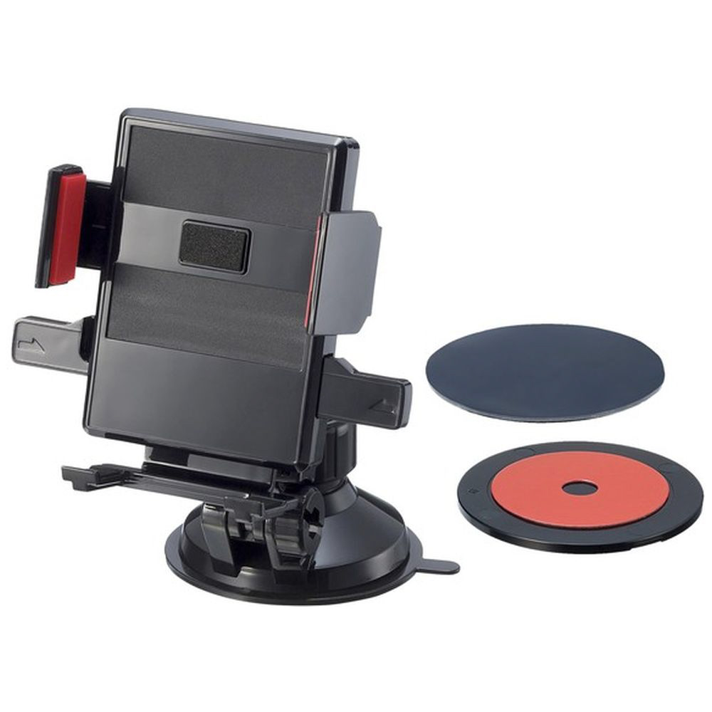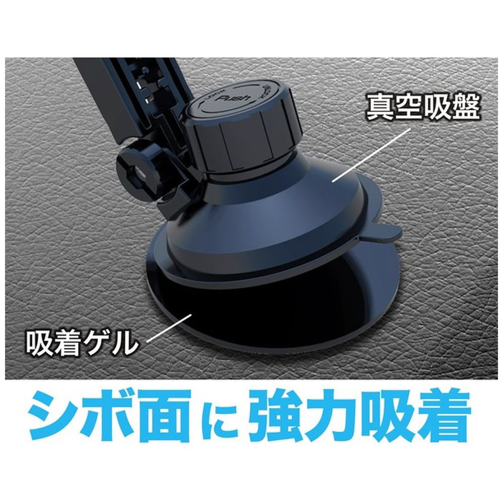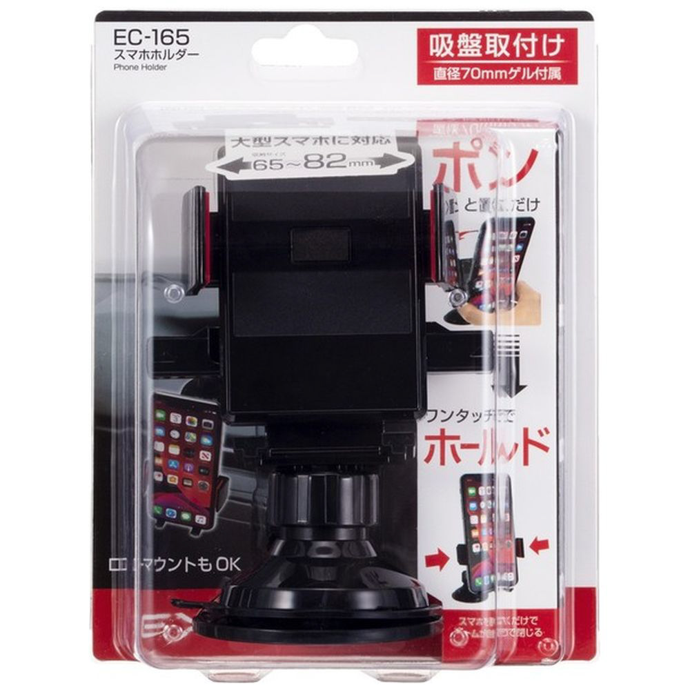 ワンタッチでスマホをホールドできる便利な吸盤式ホルダー。幅65〜82mmのスマホに対応。ゲルと補助板付きで様々な場所に取り付け可能です。