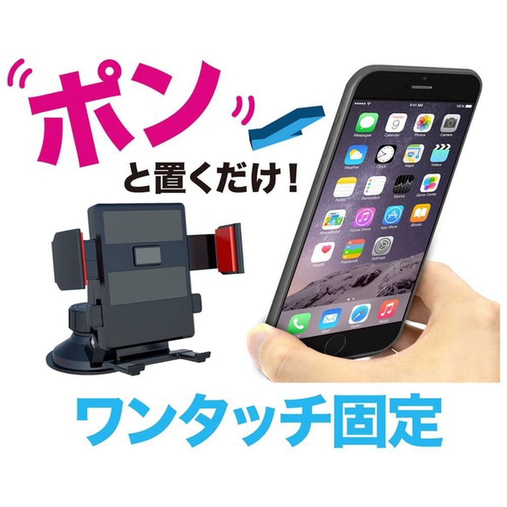 オートキャッチ機能付きで、幅65〜82mmのスマートフォンをワンタッチで挟んでホールドできるスマホホルダーです。