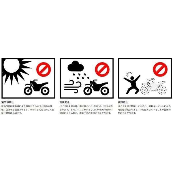 バイクを裸で駐輪していると、盗難ターゲットになる可能性が高まります。中を見えなくすることが盗難抑制につながります。