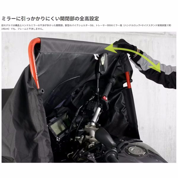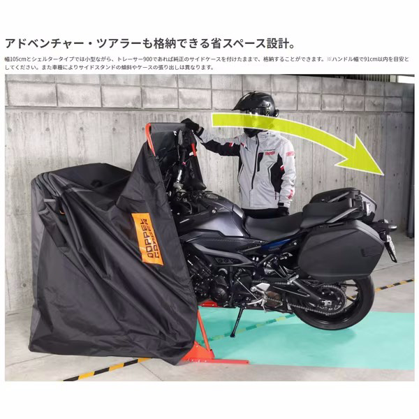 幅105cmとシェルタータイプでは小型ながら、トレーサー900であれば純正のサイドケースを付けたままで、格納することができます。