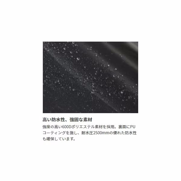 強度の高い600Dポリエステル素材を採用。裏面にPUコーティングを施し、耐水圧2500mmの優れた防水性も確保しています。