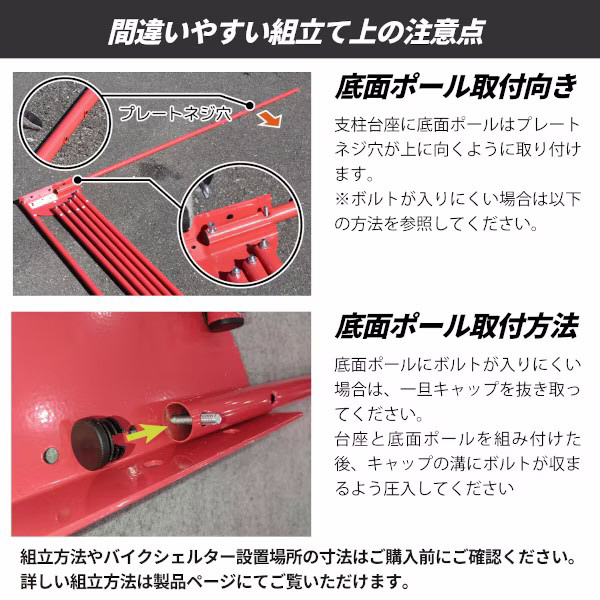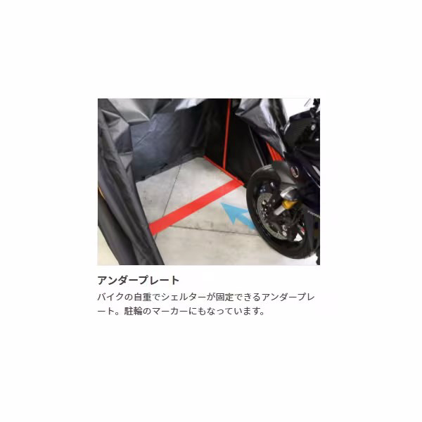 バイクの自重でシェルターが固定できるアンダープレート。駐輪のマーカーにもなっています。