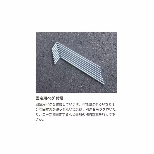 固定用ペグを付属しています。※地盤がゆるいなど十分な固定力が得られない場合は、別途おもりを置いたり、ロープで固定するなど追加の補強対策を行って下さい。