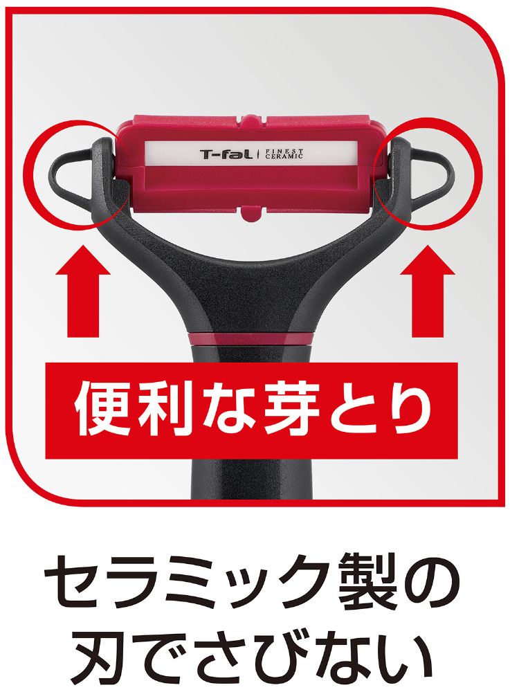 ■ブレードの左右には、じゃがいもなのど芽を取るのに便利な「芽取り」が付いています。保護カバー付きなので使った後の収納やアウトドアなどで持ち運ぶ際も安心してお使いいただけます。