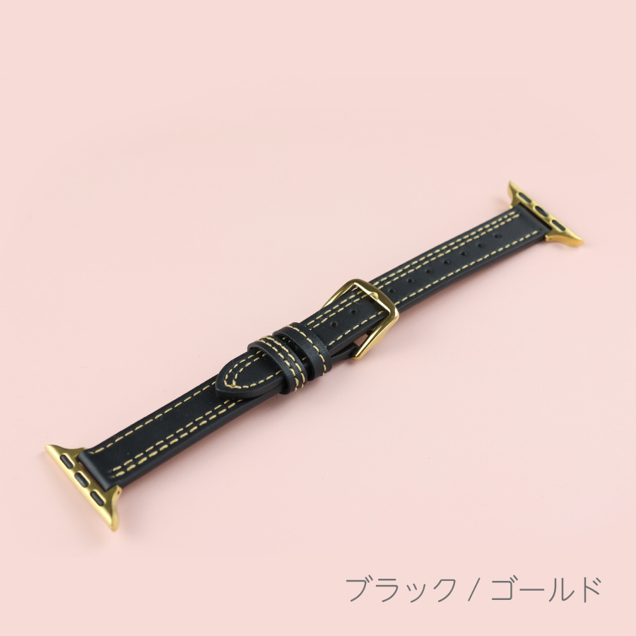 Apple Watch 41/40/38mm ステッチ スリム レザーベルト ブラック/ゴールド IQ-AW016B41-BKG