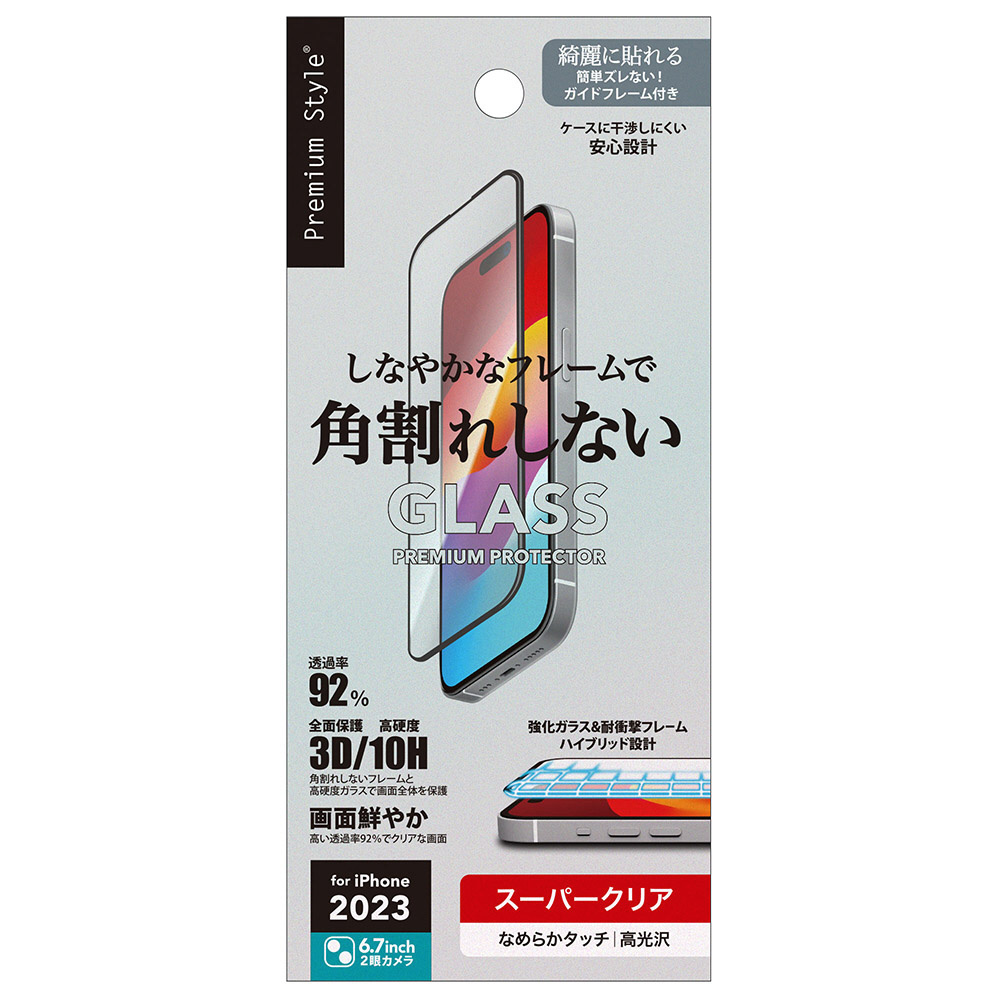 角割れを防ぐふたつの素材を使ったハイブリッド設計のiPhone 15 Plus用 液晶全面保護ガラスのスーパークリアタイプ