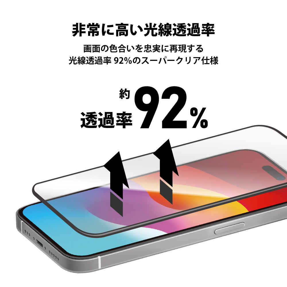 角割れを防ぐふたつの素材を使ったハイブリッド設計のiPhone 15 Plus用 液晶全面保護ガラスのスーパークリアタイプです。