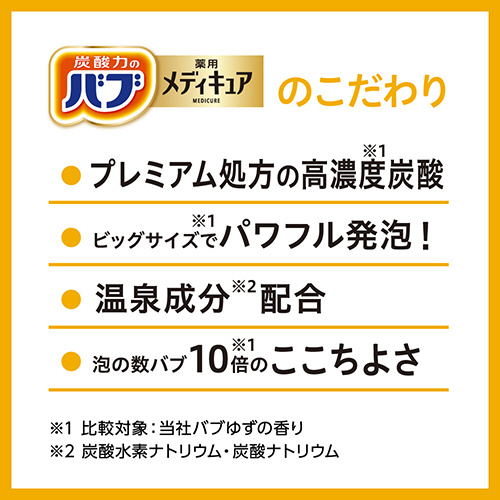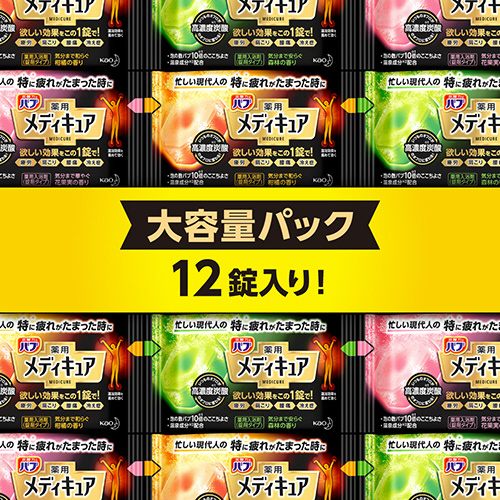 いつものオフロが高濃度※1炭酸のオフロに変わる!バブメディキュアの大容量アソートパック。3種の香りを楽しめるレギュラータイプ3種12錠。※1メーカー比