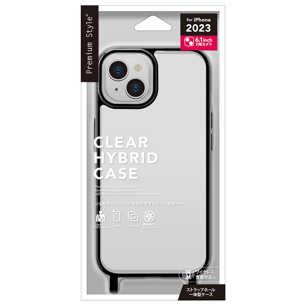 持ち運びに便利なショルダーストラップやハンドストラップを取り付けられるiPhone 15用 ショルダーストラップホール付クリアハイブリッドケースです。