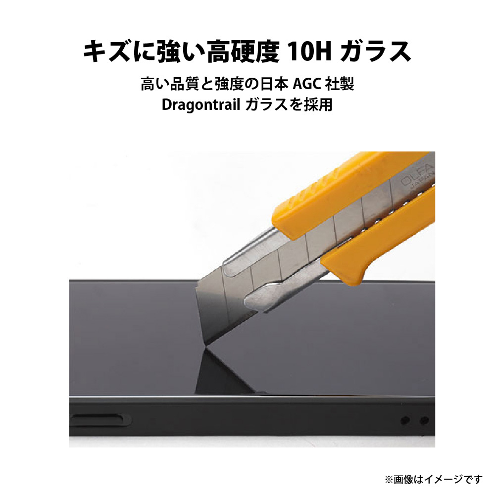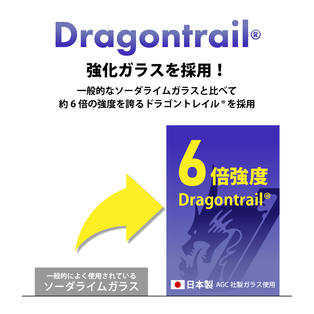 一般的なソーダライムガラスと比べ約6倍の強度を誇る「DragontrailR」ガラスを採用し、耐衝撃性が非常に強いのが特長です。