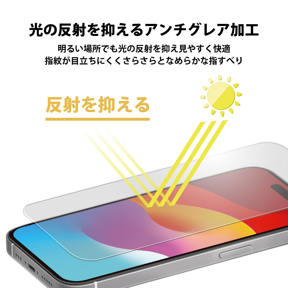 硬度10Hの強化ガラスを採用したiPhone 15/15 Pro用 液晶保護ガラスのアンチグレアタイプ