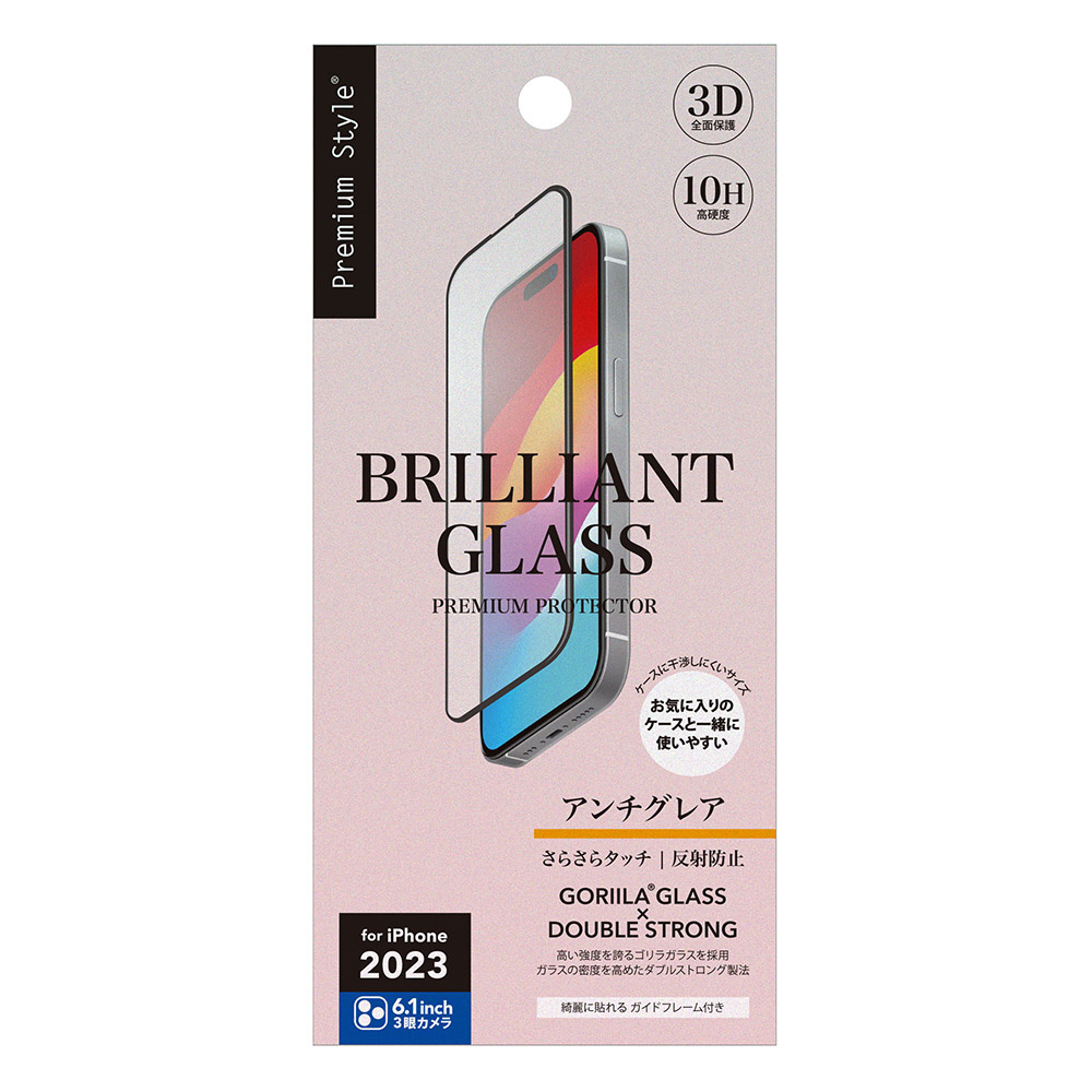 iPhone2023 6.1inch 3眼 ガイドフレーム付 液晶全面保護ガラス BRILLIANT 2度強化/ゴリラガラス アンチグレア