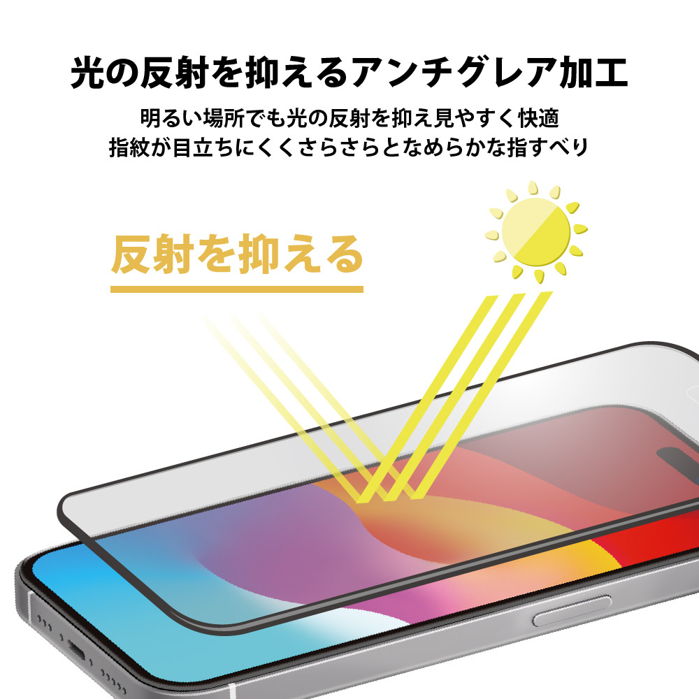 極薄でも強靭なゴリラガラスを採用し、通常ガラスの表面加工に加えて分子レベルでガラスの密度を高めたダブルストロング製法のiPhone 15 Pro用 液晶全面保護ガラス BRILLIANTモデル アンチグレアタイプです。