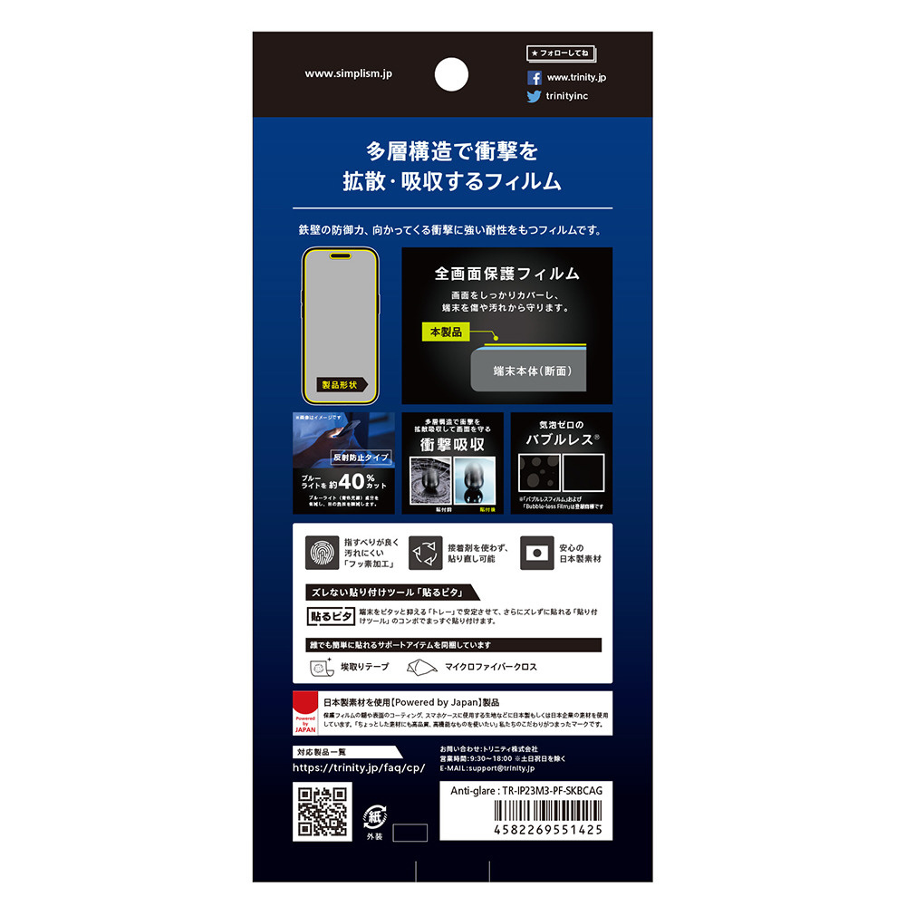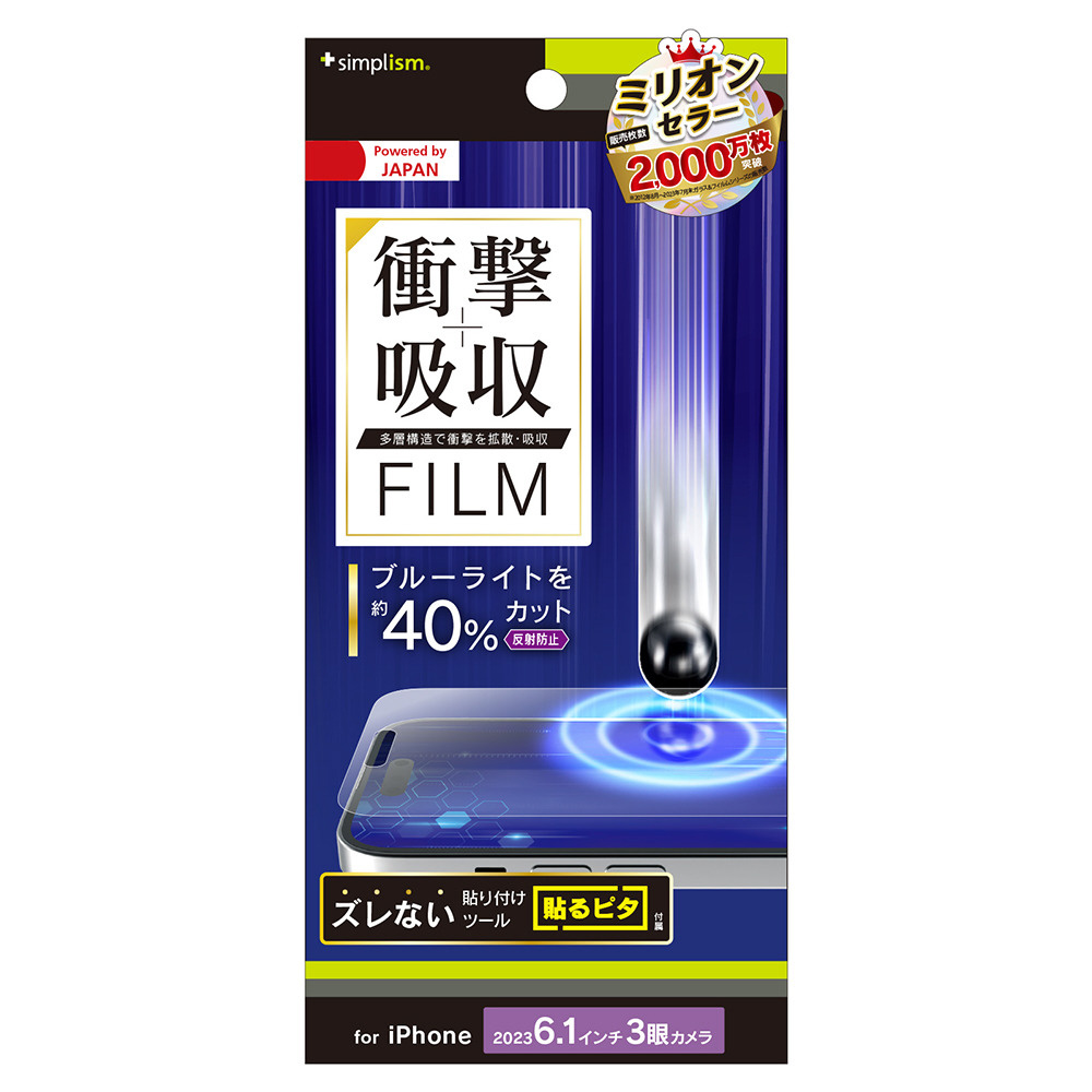 iPhone 15(6.1インチ) 3眼 衝撃吸収&ブルーライト低減 画面保護フィルム 反射防止 TR-IP23M3-PF-SKBCAG