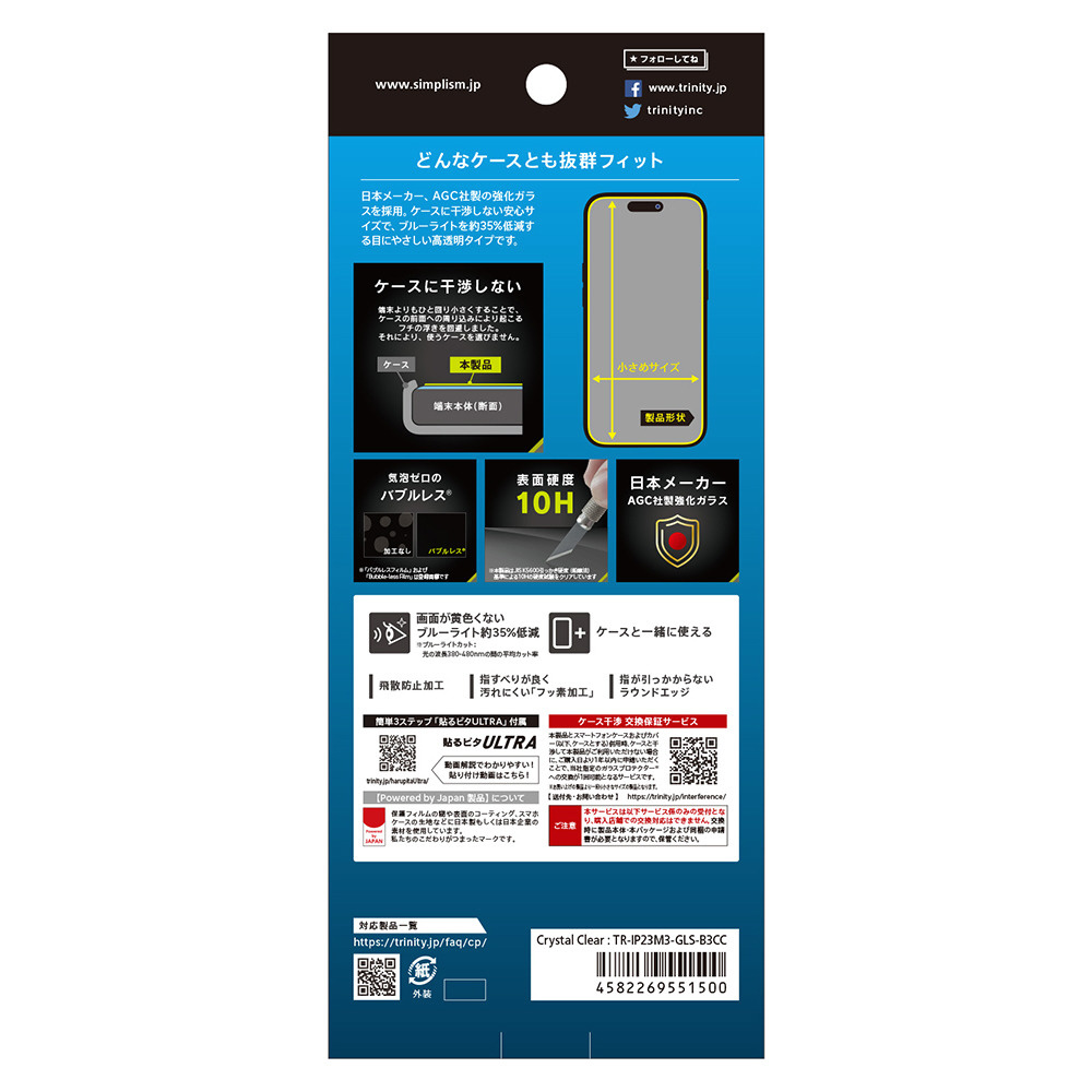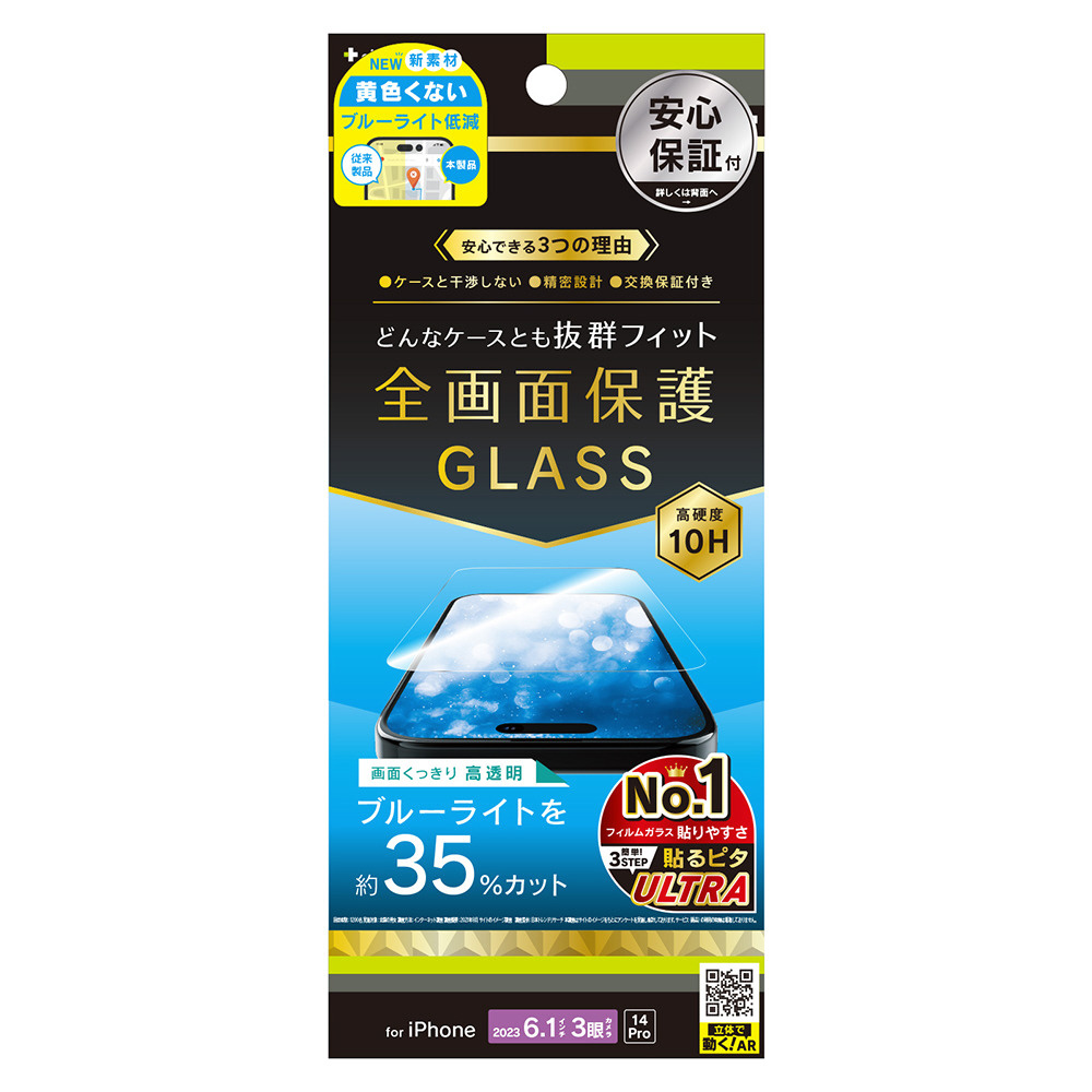iPhone 15 Pro /14 Pro 3眼 ケースとの相性抜群 黄色くないブルーライト低減 画面保護強化ガラス 光沢 TR-IP23M3-GLS-B3CC
