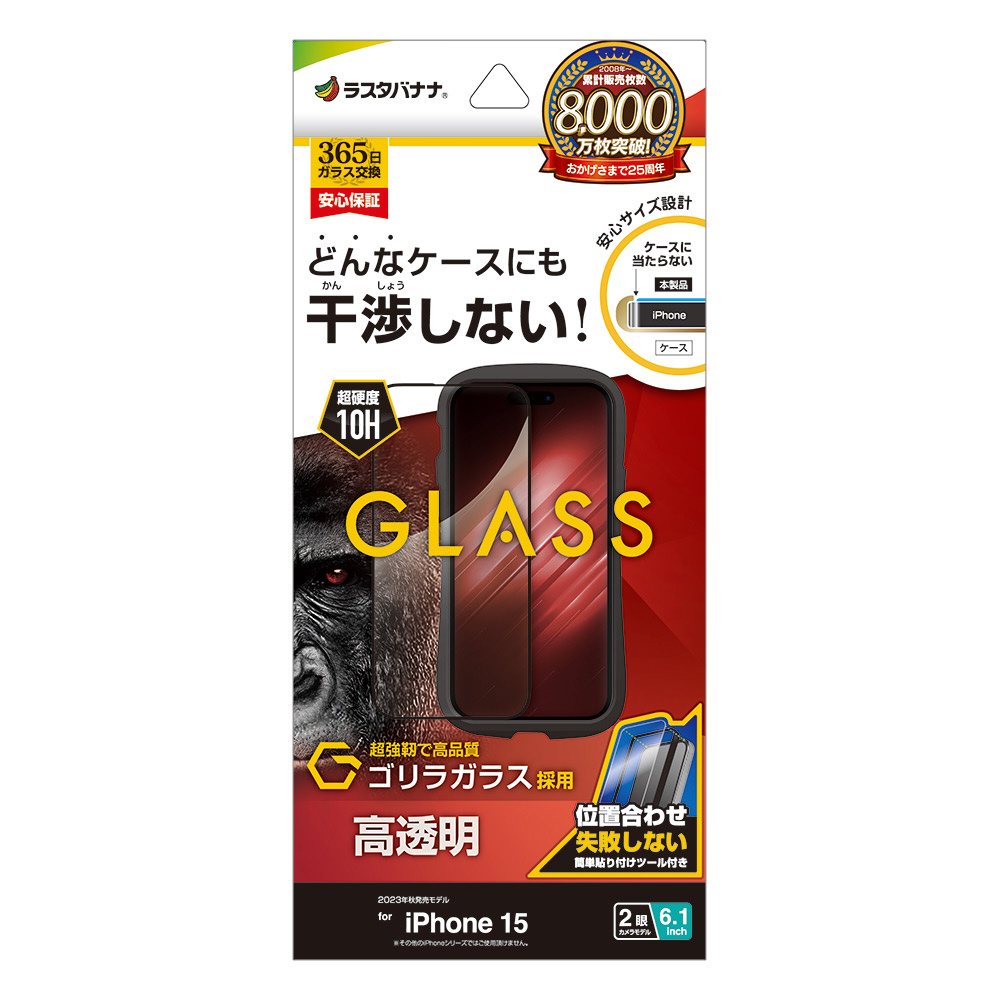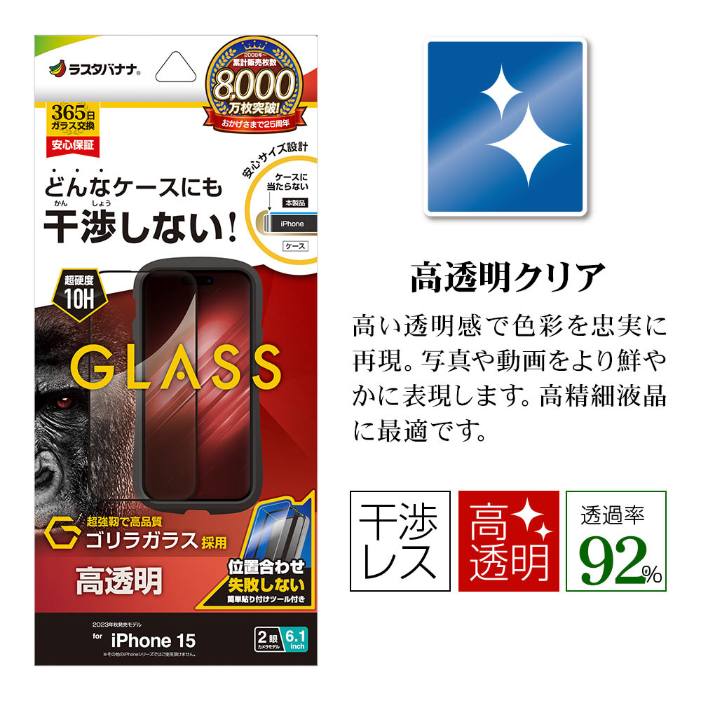 iPhone 15 ガラスフィルム ケースに干渉しない 絶妙設計フレームゴリラガラス 高光沢 簡単貼り付け治具付き