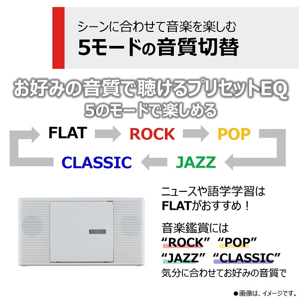 お好みの音質で聴ける!FLAT/ROCK/POP/JAZZ/CLASSICの5つの音質モードを搭載。 お好みにあったモードを設定することで、より一層楽曲を楽しむことができます。