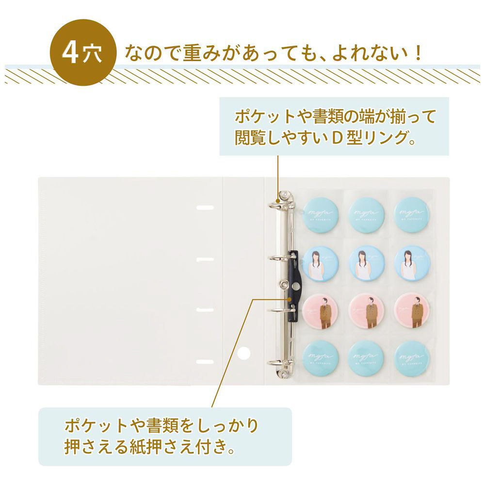 お気に入りのコレクションをまとめて保管できるファイル。ポケットや書類の端が揃って閲覧しやすいD型リング。表紙の開きを防ぐセーフティストッパー付き。ポケットや書類をしっかり押さえる紙押さえ付き。※ポケットは付いておりません。A4クリヤーホルダーが入る表紙ポケット。取り出しやすいフィンガーホール。ラベリングやデコレーションができる背見出し紙付き。