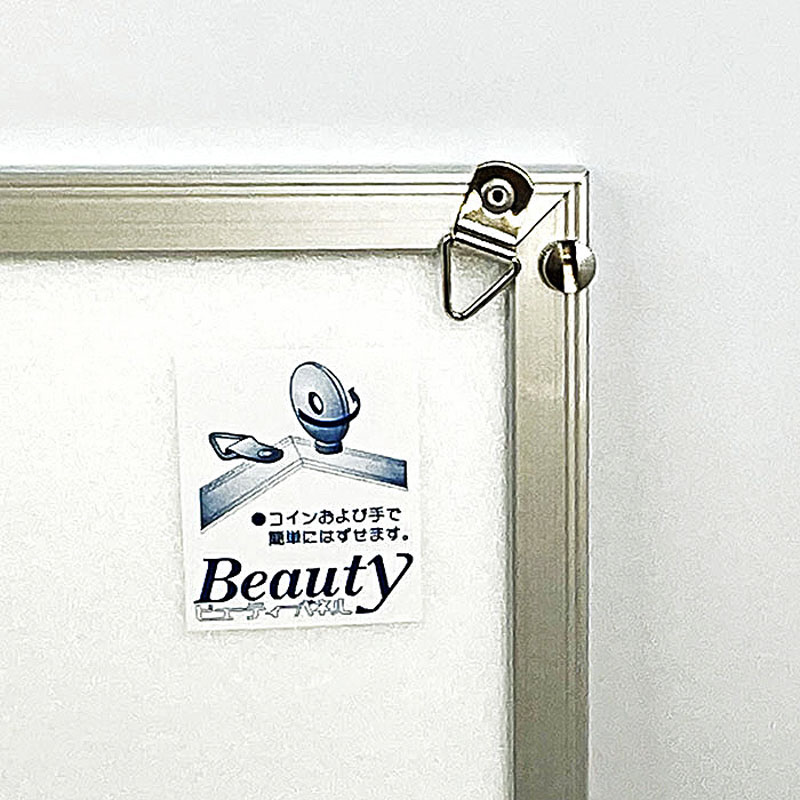 美しいポスターや写真は、いつまでも美しく飾っておきたいものです。ビューティーパネルは、シンプルなデザインのアルミフレームで美しく、楽しいパネルづくりができます。ビューティーパネルは、ビス2本を外すだけで、ポスターの入れ替えができます。吊り下げ金具が4カ所についているため、どの方向にでも吊すことができ、パネルとパネルを連結して飾ることもできます。お部屋のアクセントに。広告ポスター・説明パネル等の展示用に。オフィスや施設等の展示案内に。写真展・展示会等の作品の装飾に。飲食店のメニュー板等に。