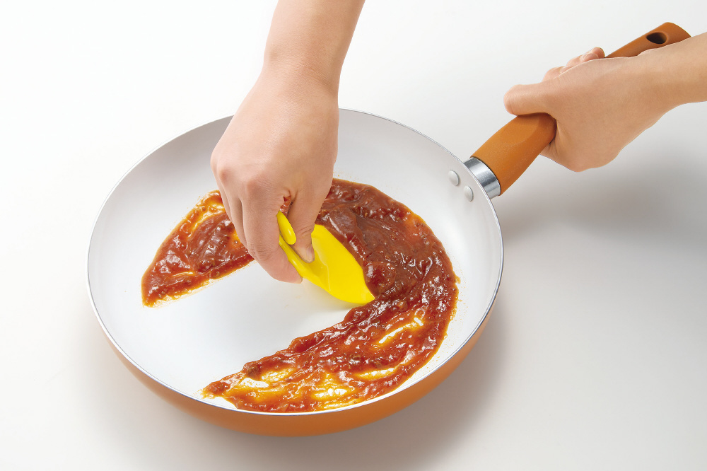 鍋やフライパンの隅やカーブにもフィットする形状で、食材をこぼさずきれいに集められます。