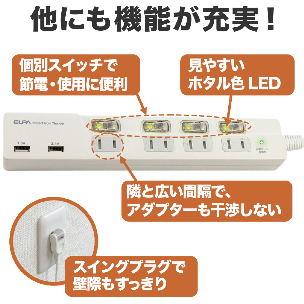 耐雷USBコード付きタップ WBK4232SUAW WBK-4232SUA(W) [2ポート]