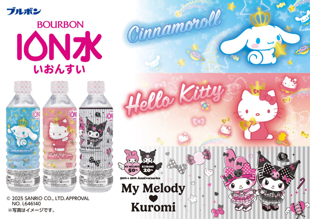 人気のサンリオキャラクターのかわいいオリジナルデザインのイオン水です。絵柄は、シナモロール、ハローキティ、マイメロディとクロミの3種類になります。