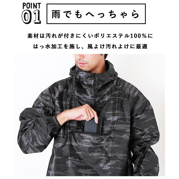 ■作業中の泥や汚れ、風から体をガードする迷彩柄ヤッケ。