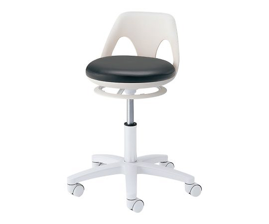 ●色:ブラック●足掛リング:無し●材質:座面/抗菌・防汚加工ビニールレザー張り、クッション材/モールドウレタンフォーム、背/PP、脚/スチール(粉体塗装)●昇降方式:ガスシリンダー式(リングレバー付き)●座面サイズ:Φ360×435〜565mm●本体サイズ:520×495×615〜745mm●重量:8.5kg