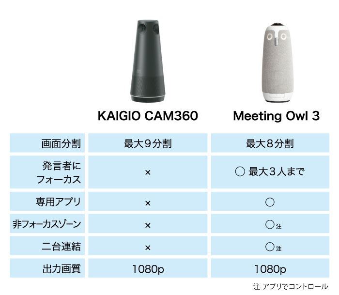 「カイギオカム」「ミーティングオウル」はweb会議室に必要な機材が一台で揃い、パソコンに接続するだけで会議を始められます。